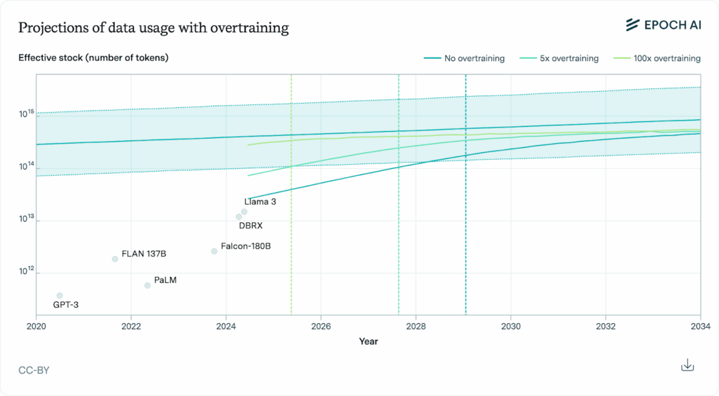 The graph (fig.2) shows the growth in training dataset sizes (measured in effective stock of tokens) against the available stock of data over time. It compares three scenarios—no overtraining (compute-optimal scaling), 5x overtraining, and 100x overtraining—showing that aggressive overtraining depletes the data stock much faster, potentially by 2025, while no overtraining delays exhaustion until around 2030.